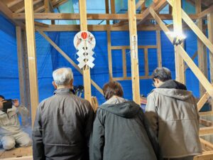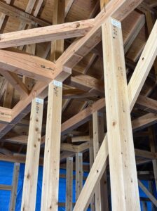 棟上げ⇒1巡目の屋根⇒気密シート⇒断熱材⇒2巡目屋根垂木