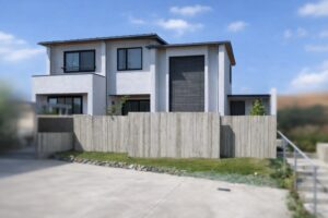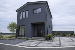 塗り壁のシックな外壁とホテルライクな床材のリビングの家